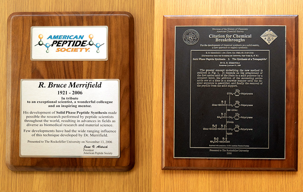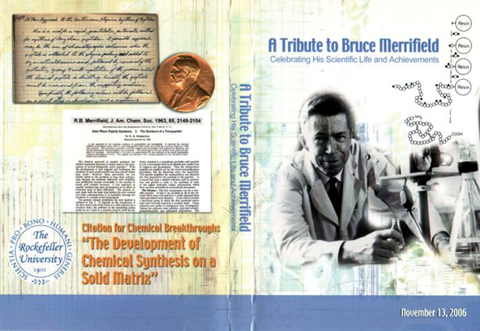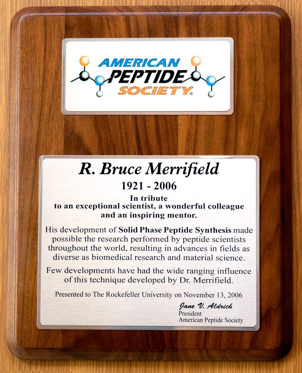 The program, entitled "A Tribute to Bruce Merrifield: Celebrating his Scientific Life and Achievements," opened with remarks from Paul Nurse, President of the University, and David Rockefeller, Honorary Chairman of the Board of Trustees. This was followed by a biographical overview of R. Bruce Merrifield, presented by Arthur M. Felix. Next, Jeffrey I. Seeman, founding editor of the American Chemical Society, ACS, "Profiles, Pathways and Dreams" series in which Bruce's 1993 scientific autobiography, "Life During a Golden Age of Peptide Chemistry" appeared, presented a plaque commemorating Merrifield's groundbreaking 1963 JACS paper as an inaugural recipient of the ACS Division of History "Citation for Chemical Breakthroughs." Then, American Peptide Society, APS, President Jane V. Aldrich presented a plaque commemorating Merrifield's life and career contributions. Both the ACS and APS plaques are now displayed at the entrance to renovated laboratories on the fourth floor of Flexner Hall, where Merrifield worked. A 12-minute video, "Invention and Development of Solid Phase Peptide Synthesis," presented Merrifield's description, excerpted from the larger video project, of how he came up with the idea of peptide synthesis on a solid support, SPPS.